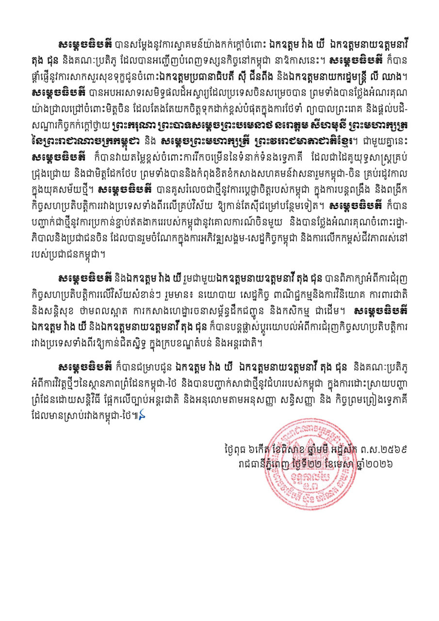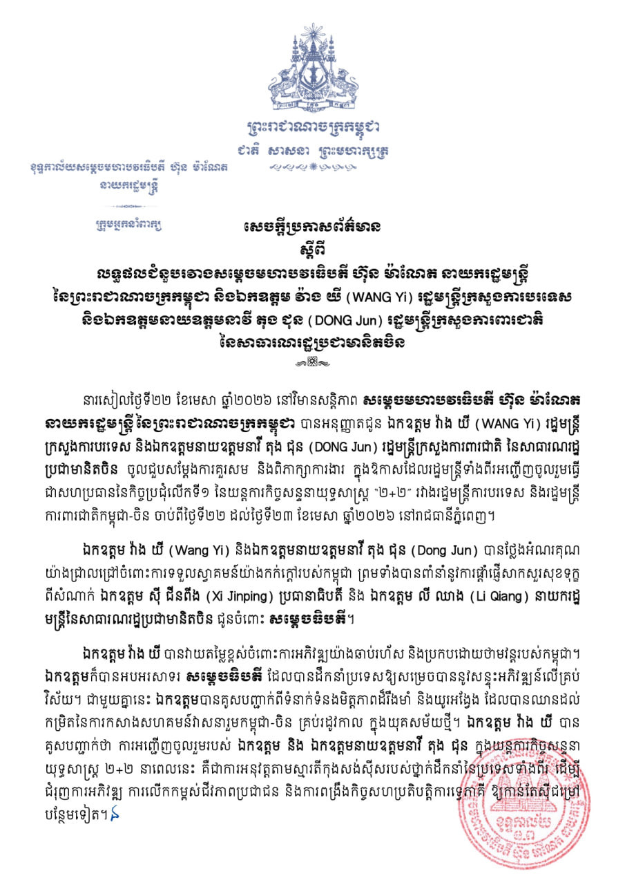ព័ត៌មានក្នុងស្រុក នយោបាយ លទ្ធផលជំនួបរវាងសម្តេចមហាបវរធិបតី ហ៊ុន ម៉ាណែត និងឯកឧត្តម វ៉ាង យី (WANG Yi) លទ្ធផលជំនួបរវាងសម្តេចមហាបវរធិបតី ហ៊ុន ម៉ាណែត នាយករដ្ឋមន្ត្រី នៃព្រះរាជាណាចក្រកម្ពុជា និងឯកឧត្តម វ៉ាង យី (WANG Yi) រដ្ឋមន្ត្រីក្រសួងការបរទេស និងឯកឧត្តមនាយឧត្តមនាវី តុង ជុន (DONG Jun) រដ្ឋមន្ត្រីក្រសួងការពារជាតិ នៃសាធារណរដ្ឋប្រជាមានិតចិន Khmer Village Official Verified Account Follow Khmer Village គឺជាអង្គភាពសារព័ត៌មានឯករាជ្យ និងគួរឱ្យទុកចិត្ត ដែលផ្តល់ជូននូវព័ត៌មានថ្មីៗ និងទាន់ហេតុការណ៍ ពីគ្រប់ទិសទីនៅកម្ពុជា និងពិភពលោក។