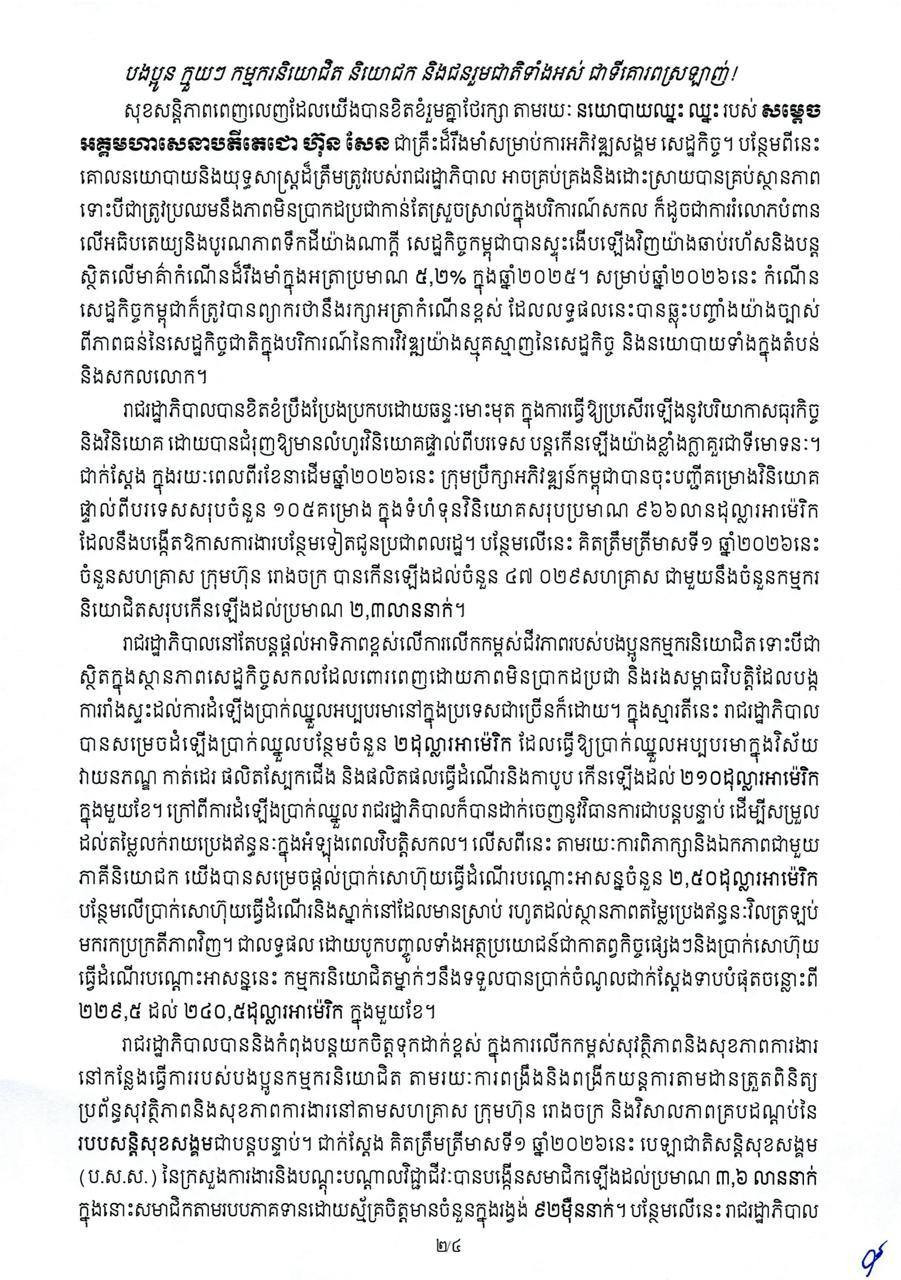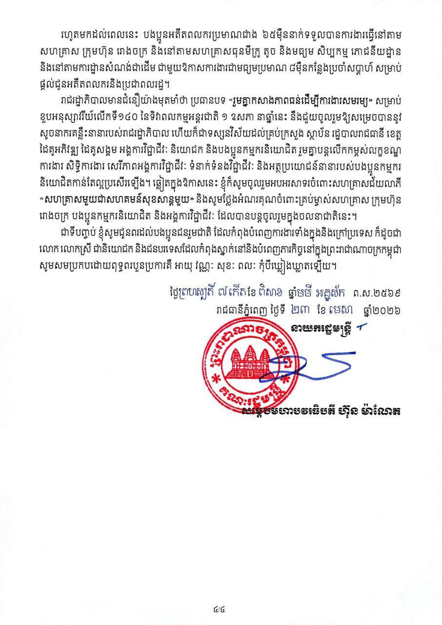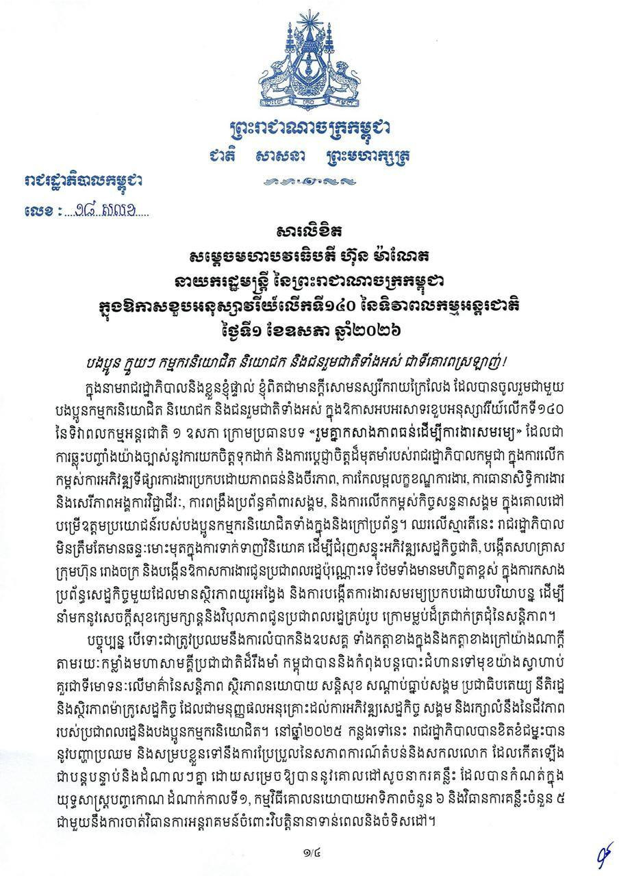សម្ដេចមហាបវរធិបតី ហ៊ុន ម៉ាណែត នាយករដ្ឋមន្ត្រីនៃព្រះរាជាណាចក្រកម្ពុជា បានចេញសារលិខិតអបអរសាទរ ក្នុងឱកាសខួបអនុស្សាវរីយ៍លើកទី១៤០ នៃទិវាពលកម្មអន្តរជាតិ ១ ឧសភា ឆ្នាំ២០២៦។ សម្រាប់ឆ្នាំនេះ ទិវាពលកម្មអន្តរជាតិត្រូវបានរៀបចំឡើងក្រោមប្រធានបទដ៏មានអត្ថន័យថា «រួមគ្នាកសាងភាពធន់ដើម្បីការងារសមរម្យ» ដើម្បីបង្ហាញពីការយកចិត្តទុកដាក់ខ្ពស់របស់រាជរដ្ឋាភិបាល ចំពោះសិទ្ធិសេរីភាព និងជីវភាពរបស់បងប្អូនកម្មករនិយោជិតទាំងអស់។